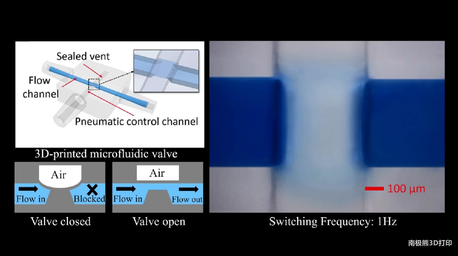 為了在適合微流控設備的微觀層面上準確地在透明樹脂中創建通道,該團隊開發了一個獨特的輔助平臺,該平臺在光源和打印設備之間移動,阻擋光線使通道壁內的液體凝固,這樣就可以在設備的頂部單獨添加通道頂。殘留在通道內的樹脂仍將處于液體狀態,然后可以在打印完成后被沖出,形成通道空間。