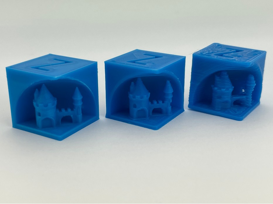 △這些3D打印的立方體展示了打印速度是如何影響零件質(zhì)量的。從左到右,20毫米立方體分別用0.2毫米、0.4毫米和1.0毫米噴嘴打印;層高等于每個(gè)噴嘴孔直徑的50%。構(gòu)建時(shí)間分別為分別為13分鐘、37分鐘和8分鐘。圖片來(lái)自Micro Swiss
