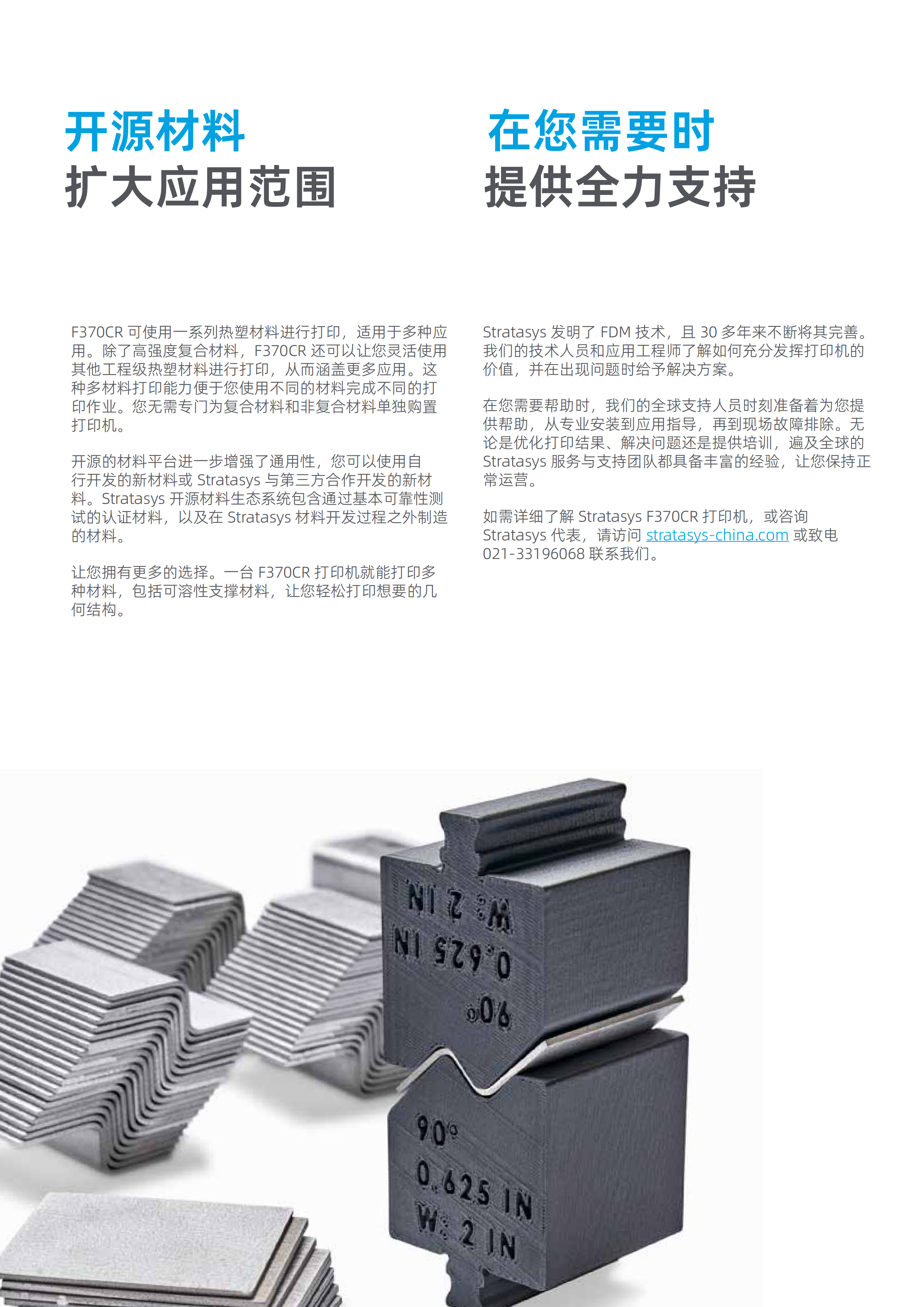 F370CR 可使用一系列熱塑材料進行打印,適用于多種應用。除了高強度復合材料,F(xiàn)370CR 還可以讓您靈活使用其他工程級熱塑材料進行打印,從而涵蓋更多應用。開源的材料平臺進一步增強了通用性,您可以使用自行開發(fā)的新材料或與第三方合作開發(fā)的新材料。Stratasys 開源材料生態(tài)系統(tǒng)包含通過基本可靠性測試的認證材料,以及在 Stratasys 材料開發(fā)過程之外制造的材料,讓您擁有更多的選擇。