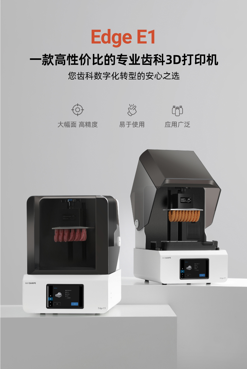 Rayshape高性價比的專業(yè)齒科3D打印機開啟數(shù)字化齒科的理想之選,Edge E1系列視覺層次豐富,質(zhì)感細膩,操作細節(jié)對用戶友好取拿成型平臺與樹脂槽等高頻操作,均可以在較短路徑完成操作。