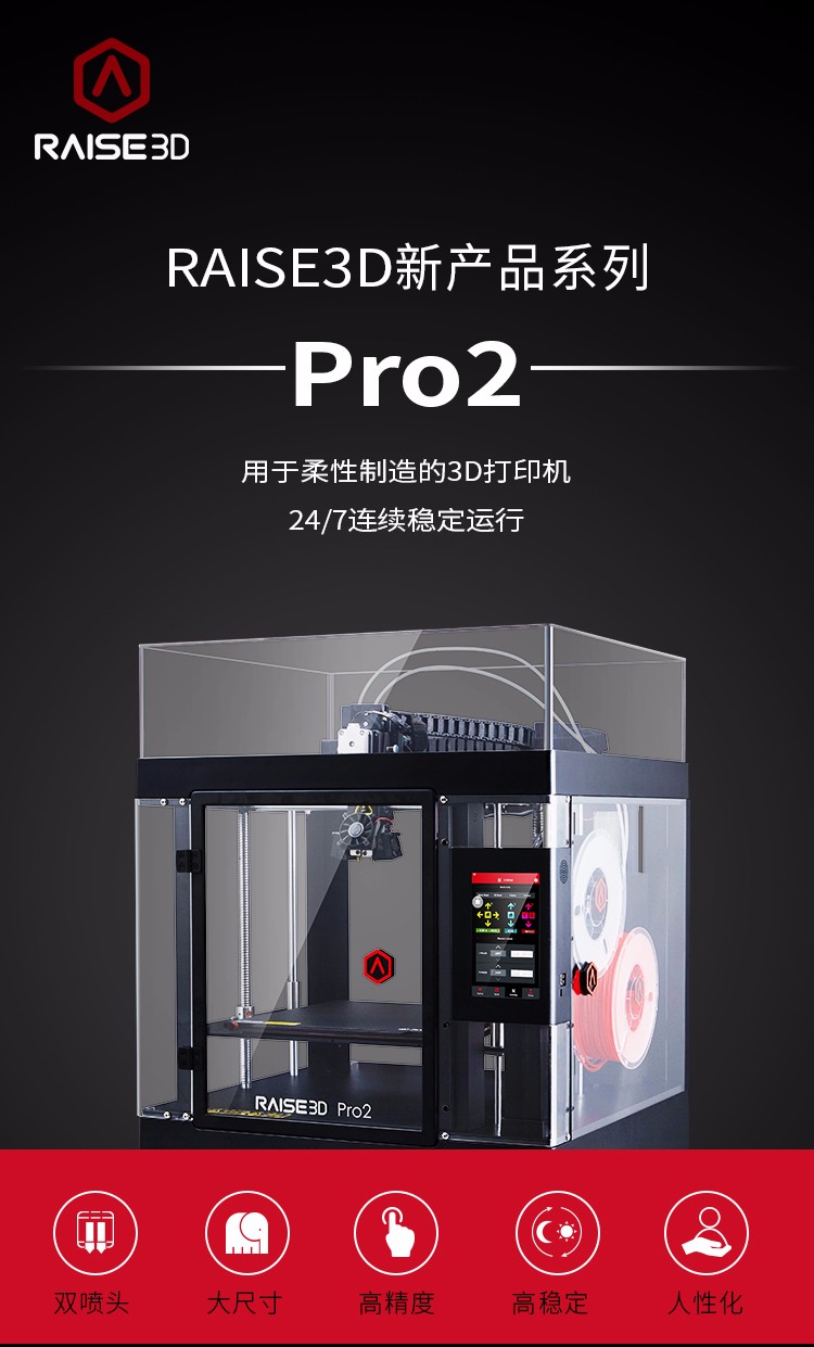 Raise Pro 2用于柔性制造的高性能3d打印機,24小時穩定運行,速度更快,質量更高,單雙噴頭,滿足你的高性能打印需求,電動雙噴頭擠出系統,免調試自動平臺,小身材,大智造!